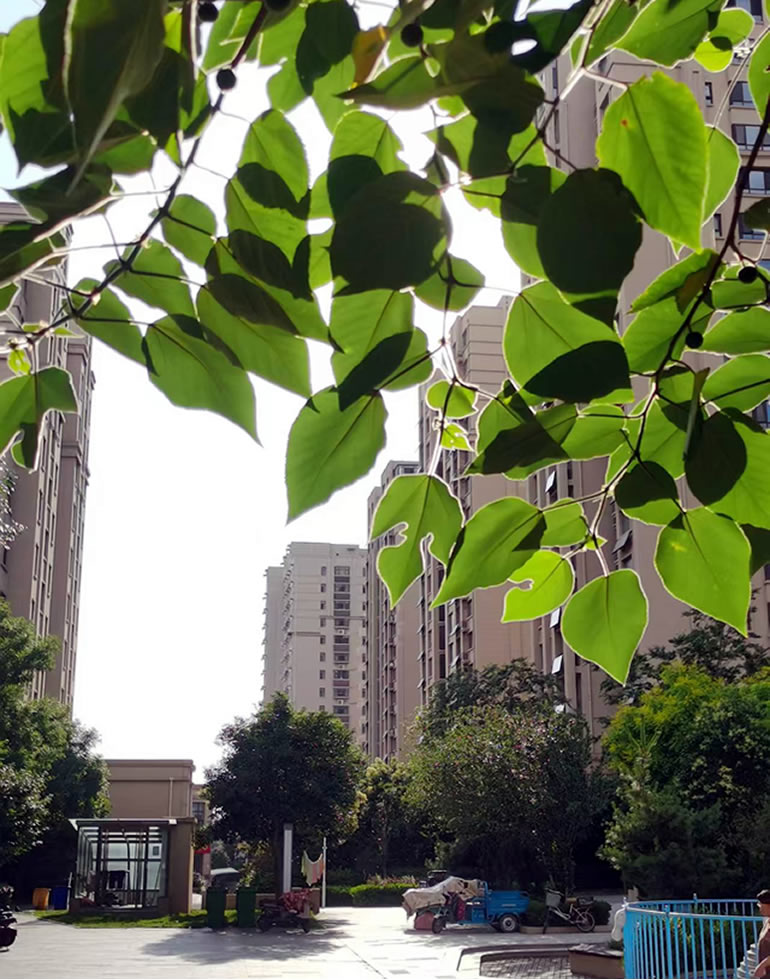 高楼巍峨穿碧宇,翠影环庭透绿光